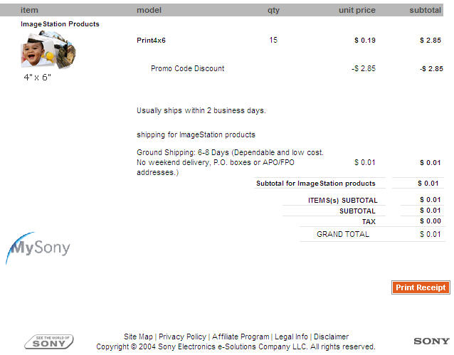 I received an offer to get 15 free prints of digital photos from Sony’s Imagestation site. So, I uploaded my photos, selected the ones I wanted prints of and entered my coupon. After the discount and the addition of shipping charges, here’s my final bill.