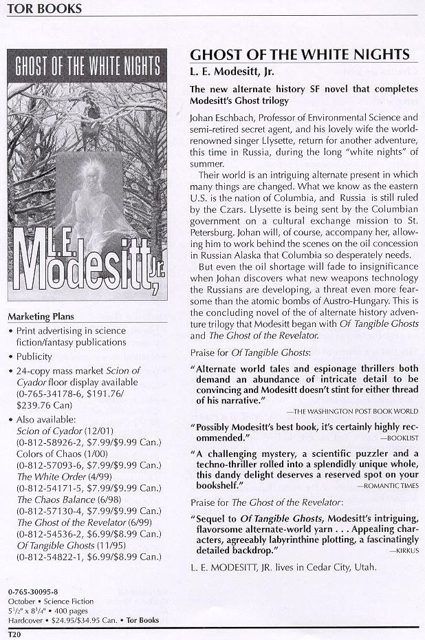 L. E. Modeistt has gained a legion of devoted fans for his science fiction as well as for his epic fantasy novels, and Ghost of the White Nights is one of the best displays of his ability to blend dramatic, imaginative stories with rigerous social and scientific extrapolation. This is the concluding novel of the alternate-history adventure trilogy that Modesitt began with Of Tangible Ghosts and The Ghost of the Revelator.