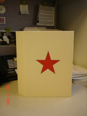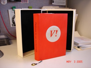 My lettered copy (M) of Life Expectancy arrived today from Charnel House. “Hand bound in red Morocco leather with a circular silver leather onlay cut to allow the V! to come through in red leather, a sewn silk book marker holding a brass grommet, and housed in a traycase bound in circus tent canvas with a red leather label in the shape of a star stamped in 22kt. gold”