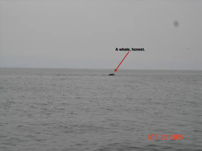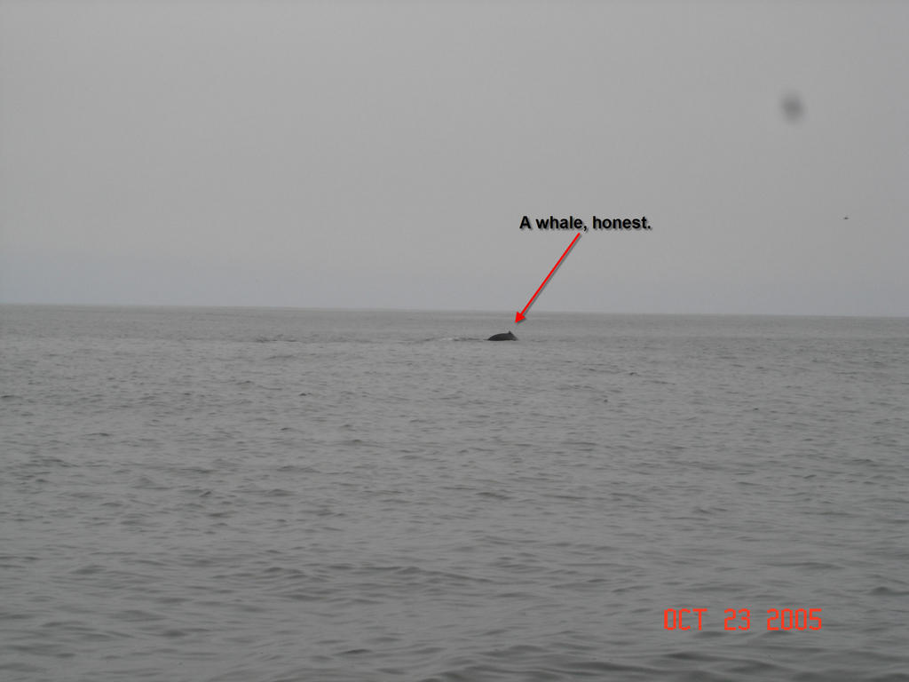 Spent most of the morning wondering around Fisherman’s Wharf looking for souvenirs and postcards. After completing that successfully, off on a boat for a three hour cruise (luckily the weather didn’t start getting rough, nor was the tiny ship tossed) to do some whale watching. We did spot a whale or two and there was a significant amount of tail wagging (by the whale, not us) but while we were too far away for my digital camera to do any god. This is the best shot I got.